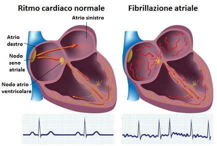 Infine, il ristagno di sangue all'interno degli atri, ed in particolare in una zona ben localizzata dell'atrio sinistro, definita auricola sinistra, può determinare la comparsa di coaguli ( trombi), che a loro volta, staccandosi ( emboli), spesso impediscono l'afflusso di sangue al cervello con conseguenze disastrose